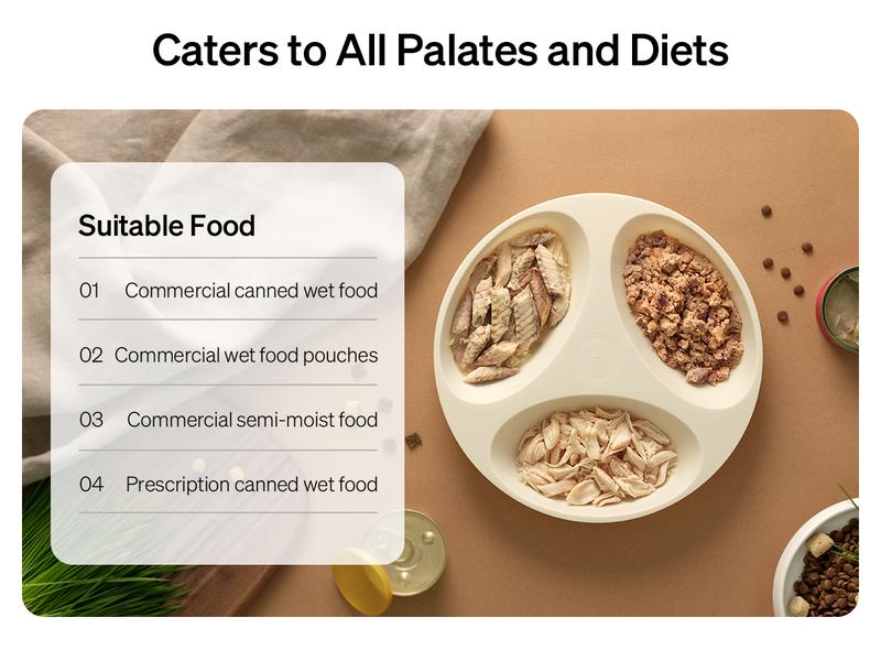 - Crafted with the Utmost Care: The lid's infrared sensor prioritizes the ultimate safety of your pet, ensuring the lid can only close if no pet activity is detected, such as if your pet is eating. In addition, just before a meal is served, the food in the relevant food section will remain in the non-refrigerated area for 30 minutes to allow the food to return to room temperature. Afterwards, the rotating lid will open (the product does not have a heating function)